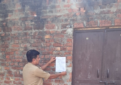 वाराणसी थाना बड़ागांव पुलिस द्वारा समीर हत्याकाण्ड में फरार 50,000/- रुपये के इनामिया अभियुक्त संदीप यादव के घर मा. न्यायालय के आदेश पर मुनादी एवं नोटिस चस्पा की कार्यवाही की गई